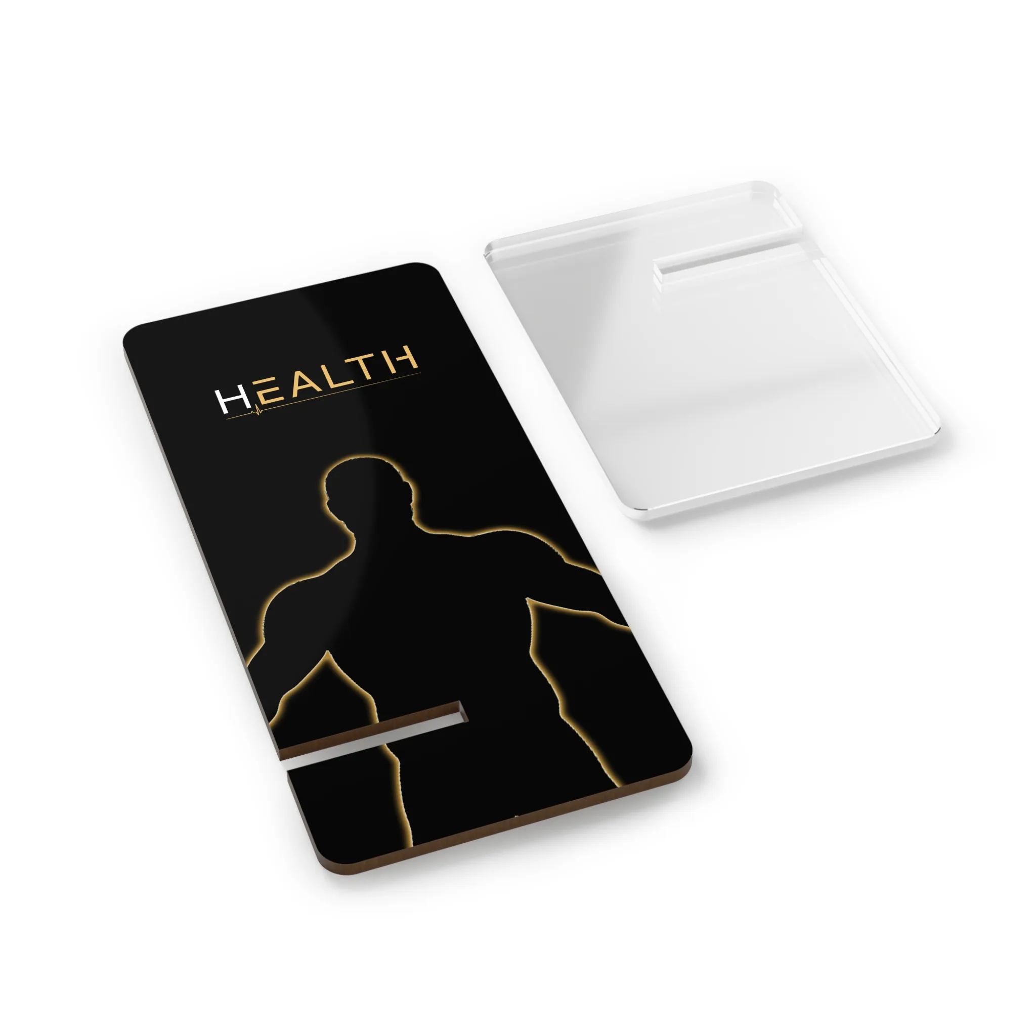 The Syncstand is more than a phone display — it’s a visual anchor for your optimized environment. Designed with a sleek acrylic base and a bold, black-and-gold HEALTH panel featuring The H silhouette, this stand blends form and function into one seamless desktop essential.